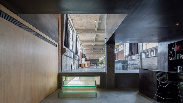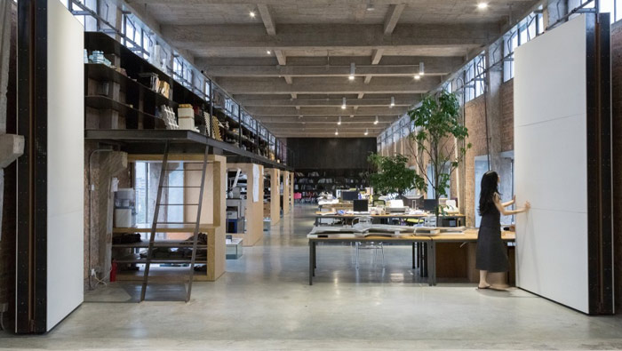 loft風格辦公室隔斷門設計:隔斷門打開整個空間連接在一起,隔斷門關閉空間被分成兩半,這樣設計使的空間擁有更大的活性,隔斷門的設計也十分精妙,不仔細看以為只是一道裝飾罷了,沒想到另有乾坤。