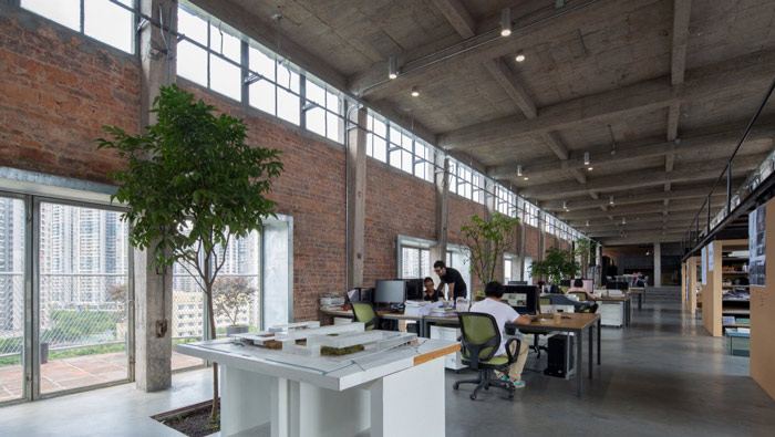 loft風格辦公室綠植設計:四季青被設計師安置在空間之中,顯然四季青是被處理過的,不會長大但卻可以一直保持綠葉,這樣空間一年四季都會有綠色,綠色給人的第一感覺就是自然,設計師希望將自然引入室內。