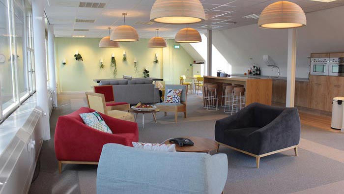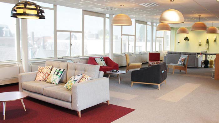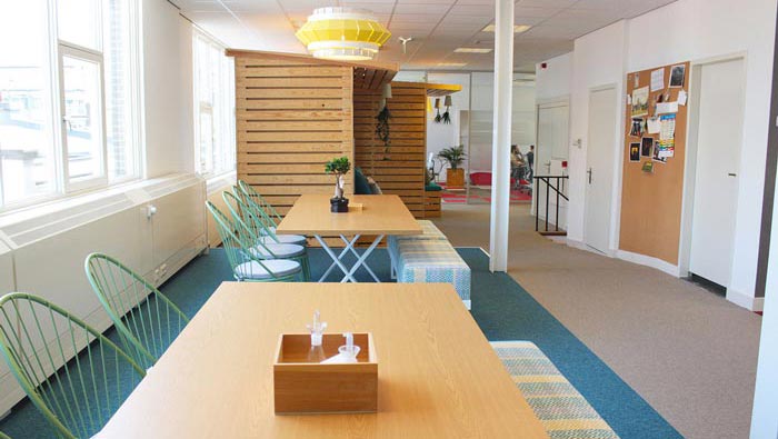 洽談區域的設計:此處整體上來說是依窗戶而設,目的就是為企業營造一個陽光、開放、開拓視野的一體化空間,設計師希望讓洽談變得不在單調,希望洽談是愉快的、是開心的,故此設計師不與遺力的營造空間的氛圍,希望讓洽談變得有趣起來,讓洽談變得像是兩個老朋友之間的交談。