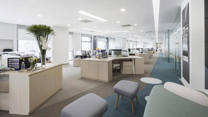 辦公區域的設計:從大局上看辦公空間好像一把把扇型分布在其中,扇形本身就有一個屬性就是向內聚合,在風水上聚合在員工的辦公之處,其次就是動線的涇渭分明,辦公工位相對獨立且又相互融合,單獨看起來每一個辦公工位都是一個主區域,整體看起來又相互并存,在心理上打消了主次的定局,加強了彼此之間的距離。