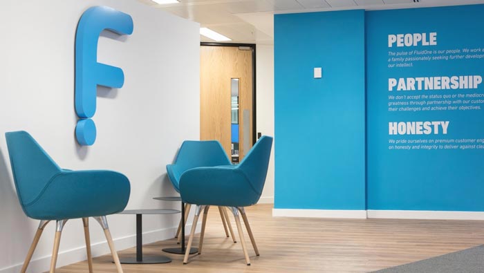 前臺的設計:設計師考察過實地之后,對前臺有了一個不同的想法,因為在設計師看來此處適合采用去前臺的設計模式,因為空間面積十分有限且有轉彎,設計師與客戶做了詳細的匯報,客戶也接受了設計師的建議,就是化不利為有利,在空間盡頭打磨出一處品牌展示區,這讓客戶進入后對企業的理念有一個直觀的認識,就是人、合作、誠實。