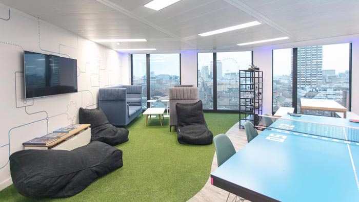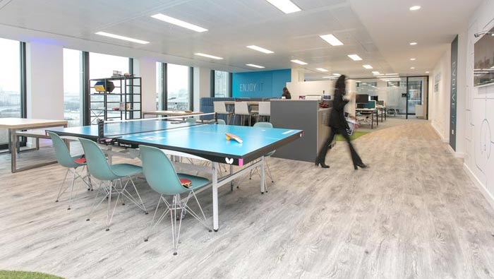 娛樂區域的設計:此處位于辦公區域的后方,這樣設計的目的就是為了調動員工的激情,因為數據本身沒有作用,但是人與數據聯合之后就有了翻天覆地的作用,以此可以看出人與數據缺一不可,這也就是設計師以人為本設計理念的展現,設計師就是希望通過激發員工的興趣,以此保持企業的創意理念得以繼承。