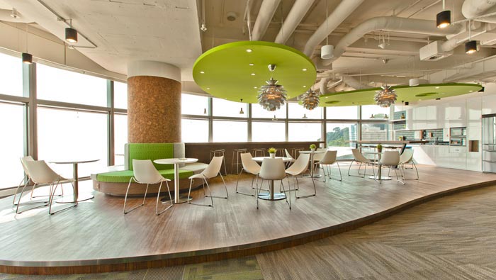 現代簡約辦公室休息區設計:此處是一個集成的空間,在空間的交流為休息區域,此處面向大海,不管是員工還是客戶在此處休息,這本身就是一種享受,讓人從繁雜的工作中脫離出來,去感受自然的神奇與美麗,以此陶冶大家的心境,讓大家在快速發展的社會中感受到一絲溫暖。