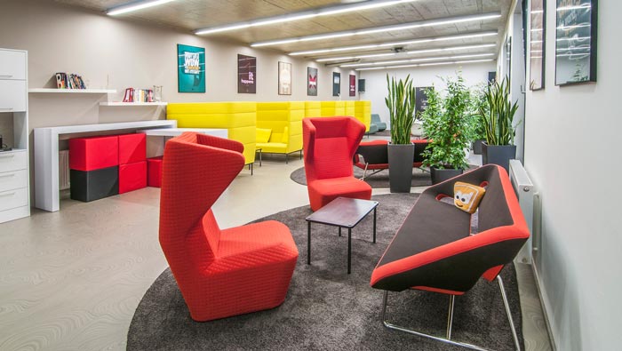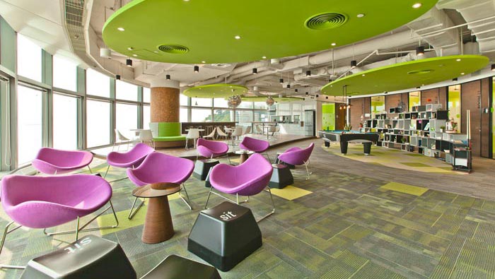 現代簡約辦公室娛樂區設計:此處是讓大家從繁忙的工作中解放出來,能放置在室內的娛樂項目本身就不多,能放置在辦公室中的娛樂項目更是少之又少,臺球就是一個不錯的選擇,因為臺球是一項老少皆宜,適合于各文化層次的既富有消閑性又具有知識性的球類活動。