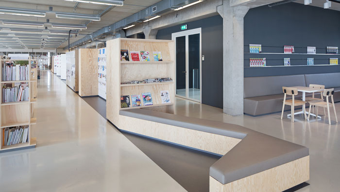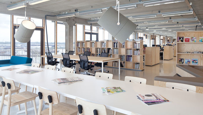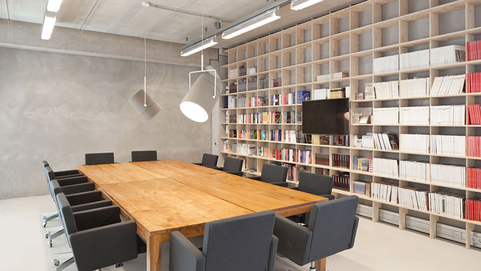 現代簡約辦公室會議室設計:此處辦公桌椅在中、一邊有書架相伴、上方都射燈,這是空間的大致格局,會議桌有四張單獨的桌子構成可分可和,分則形成四個獨立的小型會議區,合則形成一個大的會議區,充分提升了空間的靈活性,分還有一個好處就是讓此處成為閱讀區域,讓員工在書籍的陪伴下不斷充實自己。