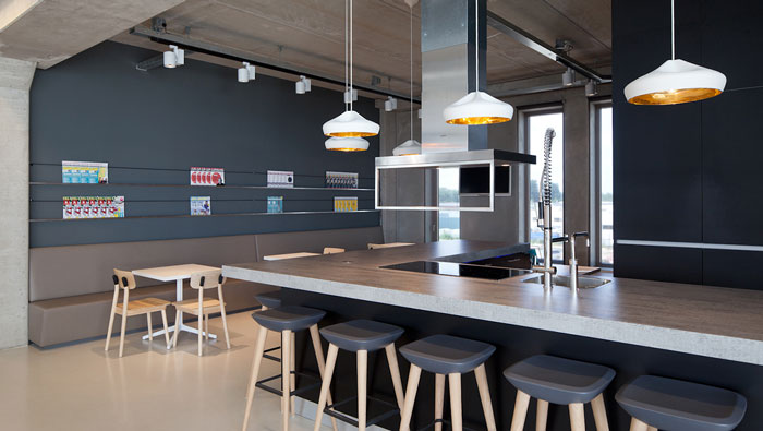現代簡約辦公室吧臺設計:在設計中設計師采用的是全封閉的設計理念,將茶水間所有裸露在外部的設施安置在吧臺之內,目的就是屏蔽所有一切的不和諧,讓空間在整體上更加的自然、簡潔,此處休息、接待、洽談、交流、學習應有盡有,空間的融合度極高也提高了辦事效率。