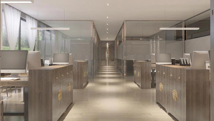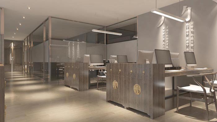本次為中式風格辦公室裝修設計項目,本次設計面積為250平方,設計師在設計的時候,首先就是到實地進行考察,然后與客戶進行交流與溝通,在雙方的溝通中了解客戶的需求,并在同時結合現場的具體情況給出相對應的設計方案構想,此方案設想來自室內結構與室外環境的雙重結合。