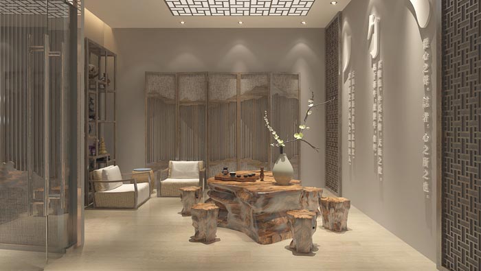洽談區域的設計:由于此處的空間屬性較為特殊,所以設計師在設計的時候,需要進行充分的考慮,因為此處需要承擔起洽談、交流、接待的作用,故此設計師與客戶商量之后決定采購一套實木造型茶桌、茶椅,設計師希望以此改變空間的整體屬性,讓空間更趨向于待客之用。