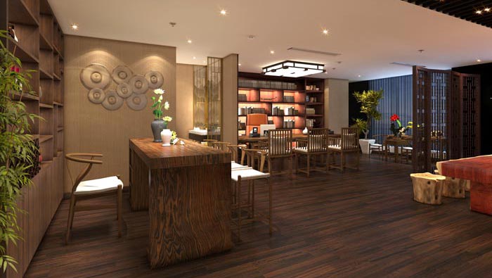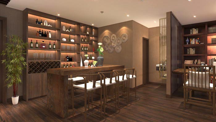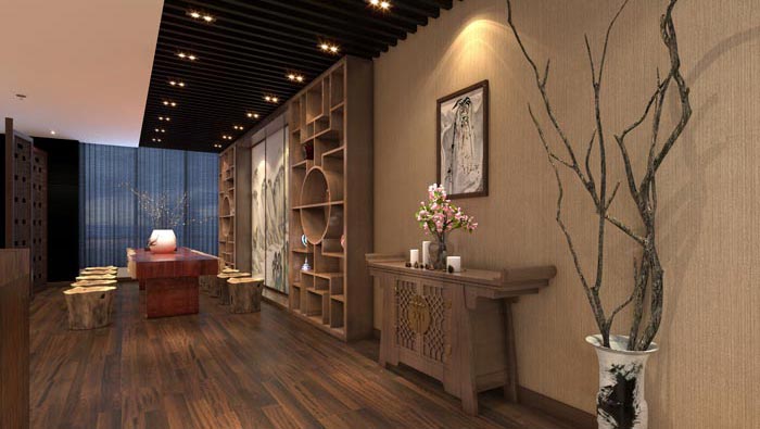 吧臺的設計:此處是空間的進門處,設計師將此處設置成吧臺,目的就是為了在情感上拉近與客戶之間的關系,在吧臺的設計中設計師融合了中式的座椅,讓人有一種錯覺就是仿佛彼此之間認識很久一般,以此讓對方在交流中慢慢放下戒心,為下一步的合作提供良好的基礎。