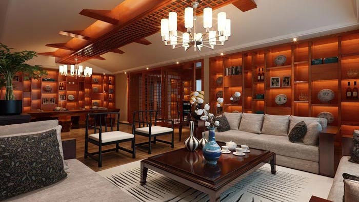 進門區域的設計:此處是邁入室內的一個轉折區域,故此設計師在設計中將阻隔的事物完全清除,目的就是打造一個暢通的空間,讓客戶進入空間后可以對整個空間有一個大致的了解,其中以中式做為設計的主風格,就是希望讓空間擁有溫馨的氛圍。