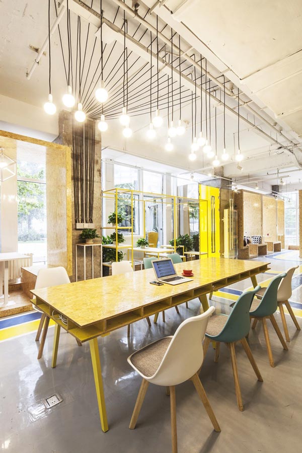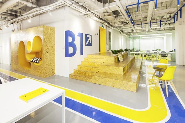 交流區(qū)域的設(shè)計(jì):設(shè)計(jì)師在設(shè)計(jì)的時(shí)候,大膽的采用黃色、白色、藍(lán)色三色結(jié)合的元素設(shè)計(jì),白色是百搭色、黃色與所有色彩有很強(qiáng)的親和力、藍(lán)色是天空的顏色,空中包含著白色與黃色,顯示出企業(yè)包容的內(nèi)涵。