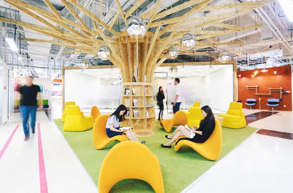 閱讀區(qū)域的設(shè)計(jì):設(shè)計(jì)師在設(shè)計(jì)的時(shí)候,在中心安置了一個(gè)樹狀模型,此模型本身是樹的形狀,為空間帶來(lái)了自然的屬性,其中分不了收納空間,周圍分不了休息場(chǎng)所,讓員工在此處學(xué)習(xí)、休息、歸零。