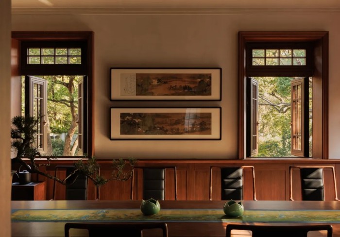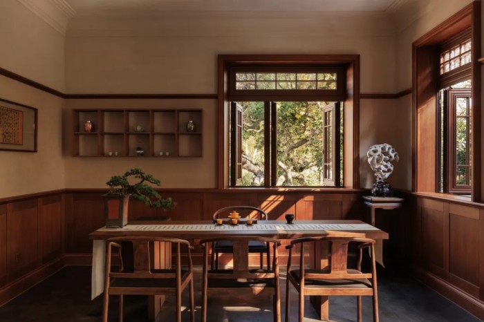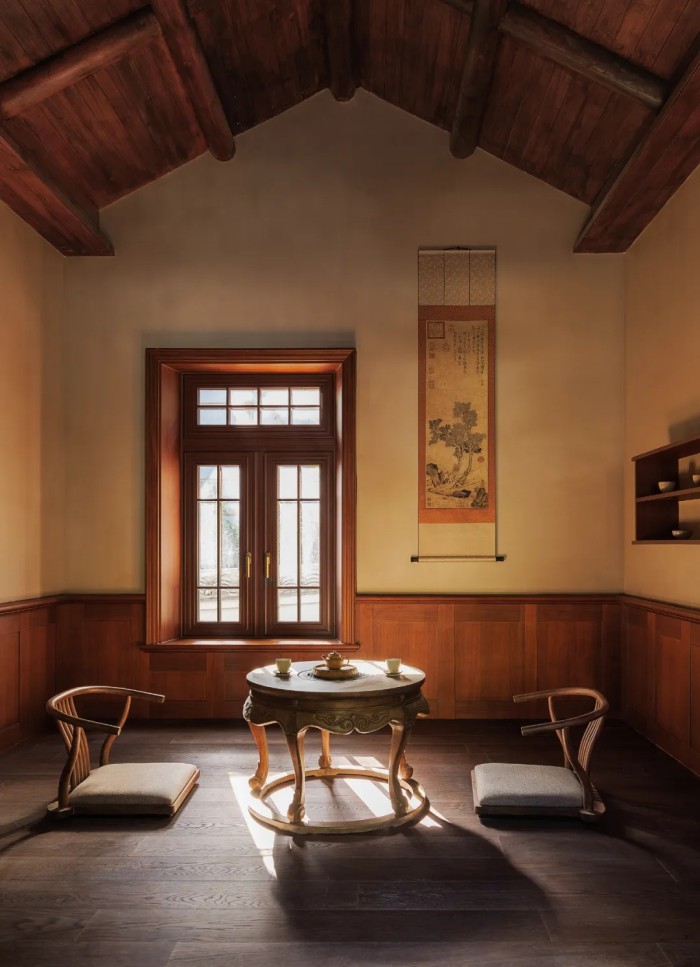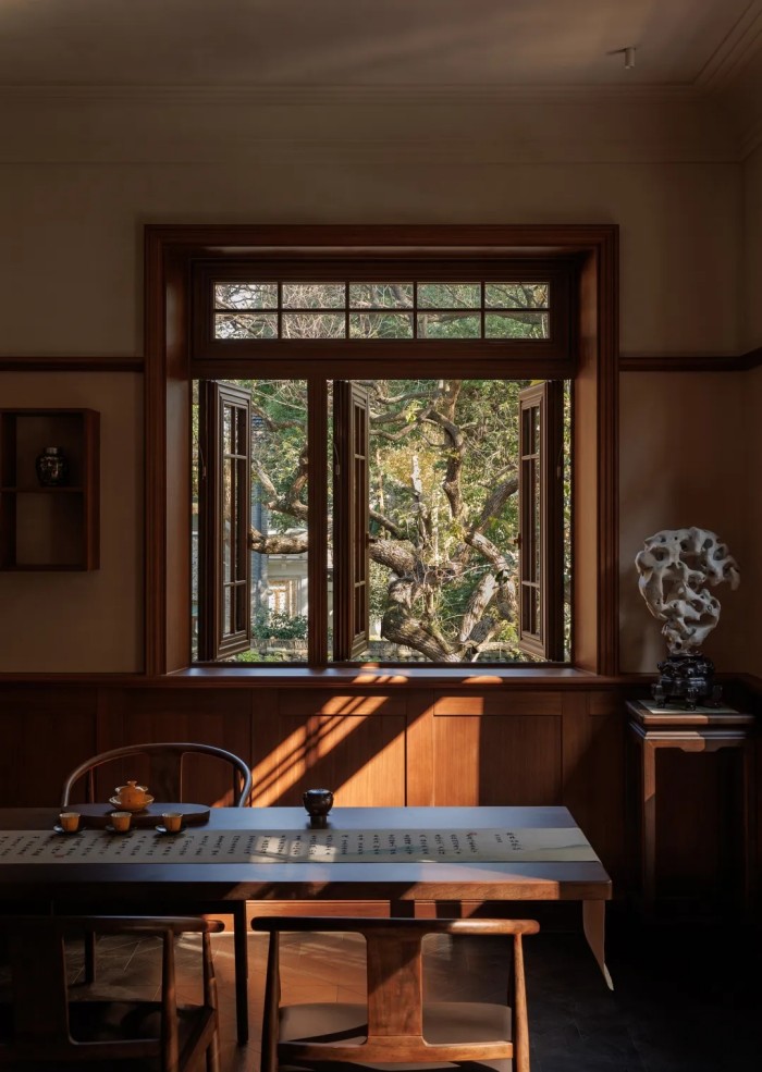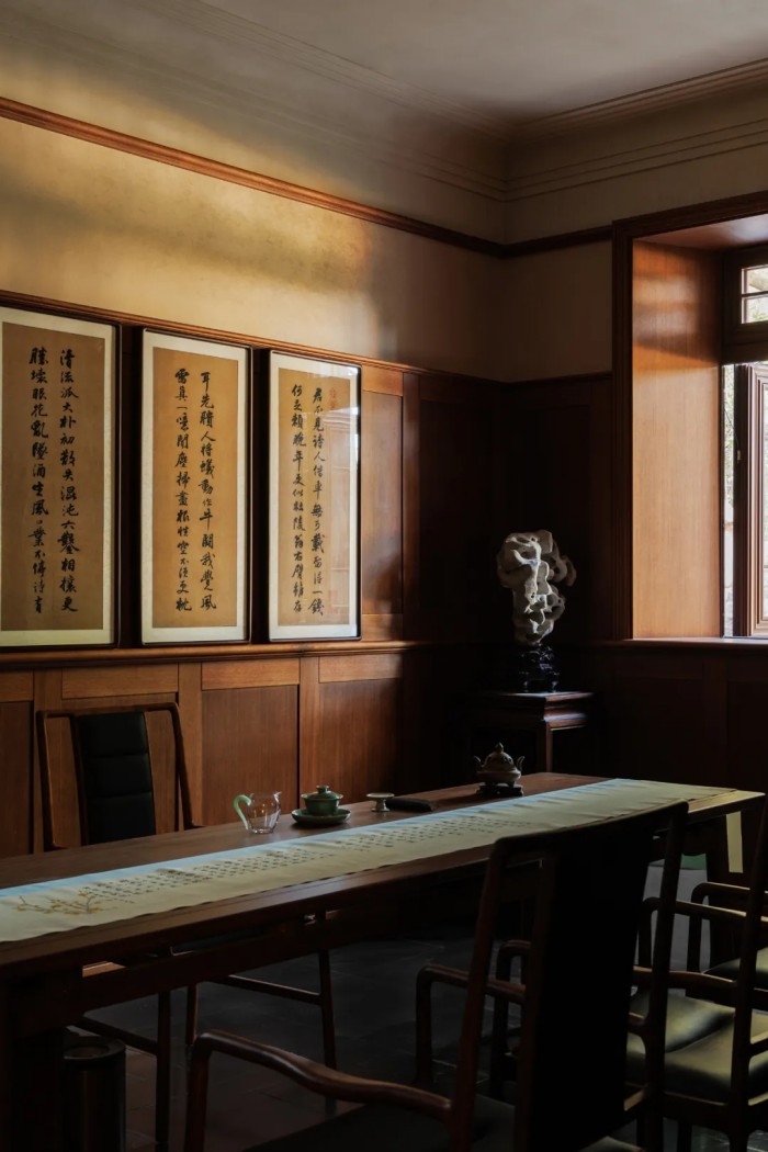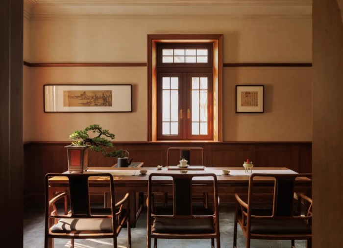 定位經營中國頂尖茶。盡管當下的茶空間多以東方禪意為主,結合古建筑的強規(guī)要求,我們選擇順應自然,修舊如舊,保持經典的民國建筑風貌。在空間中,盡力創(chuàng)造與茶人共融的克制與純粹為設計核心。
