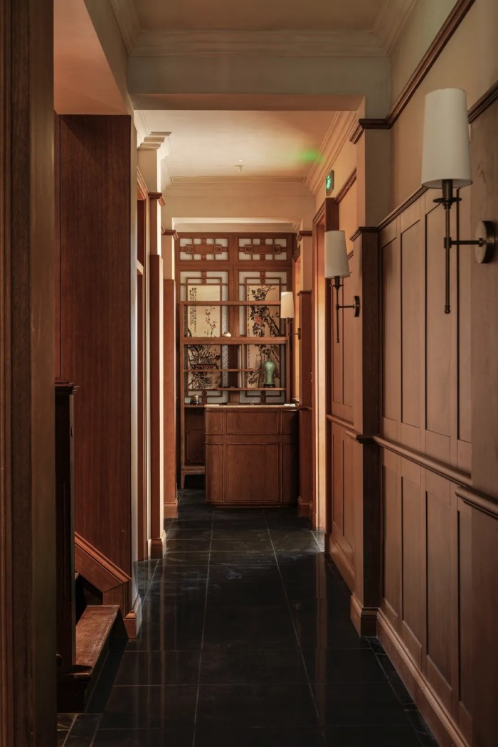 公共區(qū)域的地面采用了金磚,質樸中透著古韻;包廂采用煙灰復合地板拼花,仿佛空間中依舊隱約漂浮著民國的氣息。
