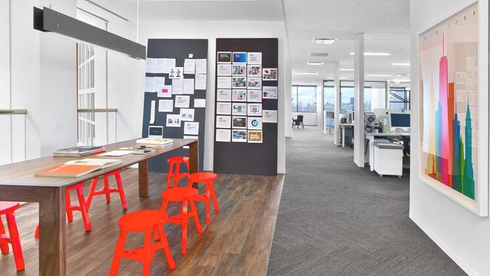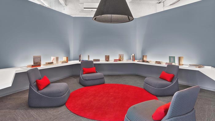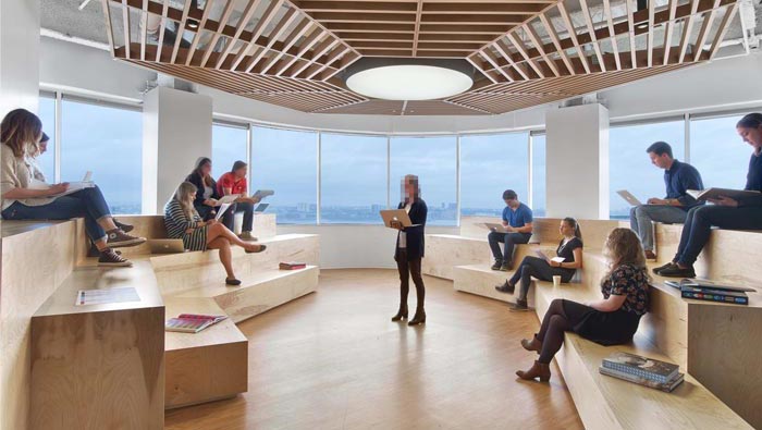 匯報區域的設計:此處是一個環形空間,這樣的空間是一個天然的匯報區域,因為空間的兩邊可以設置成類似足球場看臺的層疊式座椅,這樣可以增加空間的容納能力,同時類似三角的設計自然的向內聚集有利于匯報,同時中間區域被設計師空置出來,可以留給匯報人,讓匯報更充滿新意。