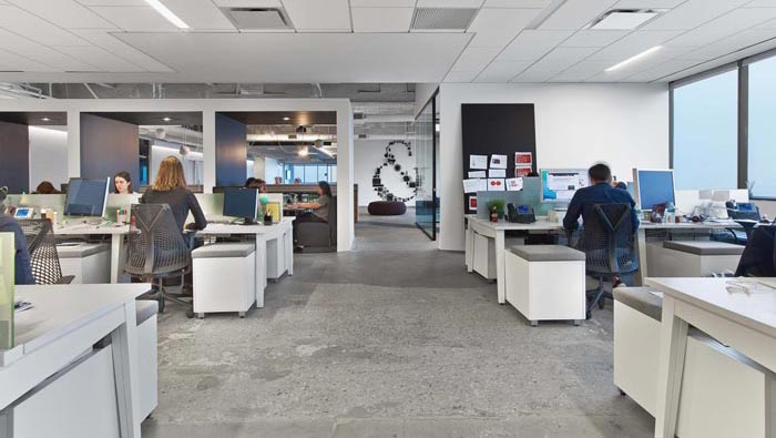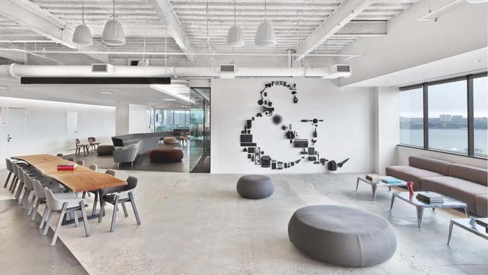 辦公區域的設計:設計師設計此地是在劃分動線之后,設計師將動線自然向內將空間分為兩半,這樣做即可以保證空間的通暢性,同時辦公區域的格局自然形成,設計師采用開放式的設計手法將辦公桌安置在空間中,在滿足辦公需求的同時設計師也重點強調人性化的設計。