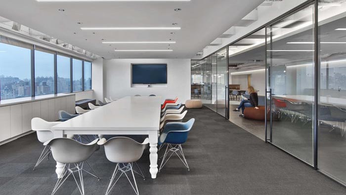 會議室的設計:設計師將其安置在空間的一個獨立空間之中,此處與外部采用玻璃隔斷進行分離,以此保證采光的完整性,同時窗簾的設置也可以保證會議室的私密性,在開展會議的時候可以將外部窗簾拉上,就可以形成一個獨立的空間,空間中沒有一點雜質,有的只是簡單,讓人的思想在空間中相互交匯。