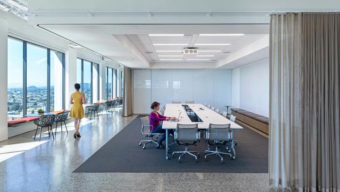 會議室的設(shè)計:設(shè)計師在設(shè)計的時候,采用了去中心的設(shè)計手法,將會議桌安置在空間的中心,讓空間得以釋放出來,與外部空間相互協(xié)調(diào),陽光透過巨大的落地窗射入室內(nèi),讓人的思緒在此處借由光得以快速的運轉(zhuǎn),太陽的創(chuàng)造力無與倫比,設(shè)計師希望借此寓意企業(yè)的創(chuàng)造力盛久不衰。