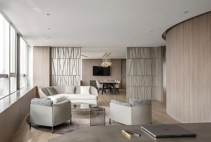 通過采用以灰色為主的色彩搭配,結合空間規劃的巧妙設計,成功營造出一種具有江南水鄉特色的濕潤、朦朧美感,突破了大廈原有條件對空間設計的限制,并將這些不利因素轉化為空間中的亮點。該設計方案不僅體現了高品味和舒適度,還展示了設計師對于空間氛圍深刻的理解和獨到的藝術見解。