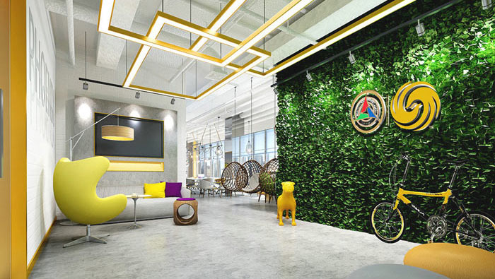 接待區域的設計:設計師在設計的時候,采用室內與室外相結合的方式,此處的室外指的是對進門區域的合理運用,設計師通過軟裝對空間進行進一步的設計,一方面不影響整個空間的運行,另一方面為企業增加新的接待方式。