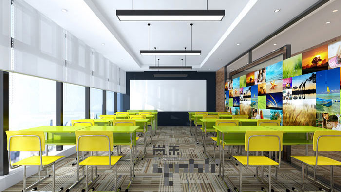 教室的設計:設計師在設計的時候,希望打造一個創意無限的空間,同時又內嵌寧靜,讓學生在這樣的空間中都可以打開心扉,踴躍的發言與積極的思考,但同時設計師考慮的是在其中尋求平衡,該寧靜的時候寧靜,該積極的時候積極,在其中領略到“中庸”的真諦。
