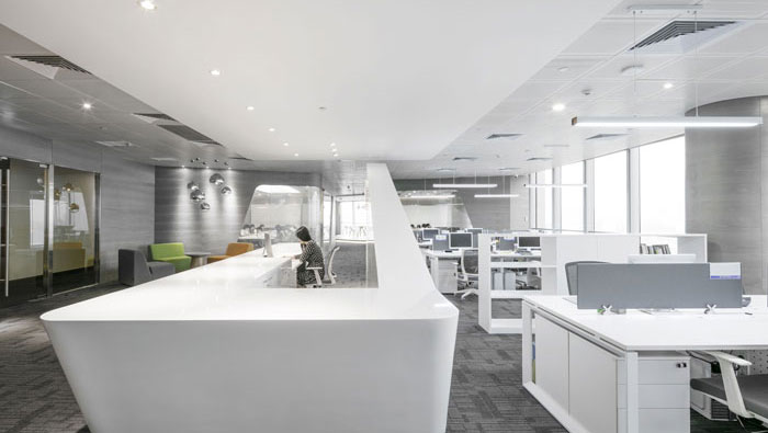 培訓機構辦公室辦公區設計:辦公區域位于前臺后方,這樣的設計是為了避免與客戶的直接接觸,雖然現在的設計講求簡潔,但是在此處阻隔不可避免,整個空間白色為主色調,為空間增添了一絲自然的氣息,設計師的目的就是希望打造簡潔、靈活、舒適的空間感受。