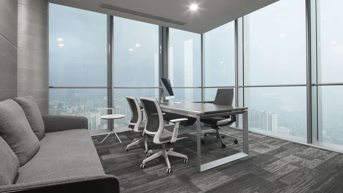 培訓機構校長辦公室設計:此處三面環繞落地窗,讓室內與室外保持真正意義上的零距離,在校長辦公之余可以俯視整個城市的美景,這樣的方式不僅可以緩解辦公的壓力,同時也在逐漸養成一個人的大局觀,設計師希望設計可以變相的促進一個人的成長。