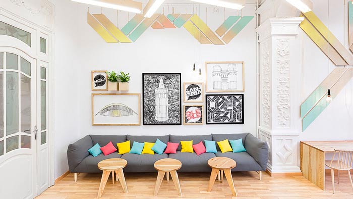 培訓機構辦公室辦公進門區設計:此次不僅提供休息,同時也承擔起接待的作用,家長、孩子、老師坐在此處相互交談,彼此了解對方,這樣的設計為雙方營造了一個不錯的交流氛圍。