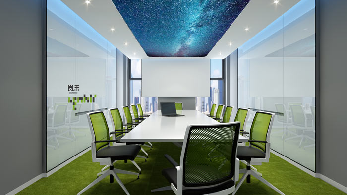 科技辦公室會(huì)議室設(shè)計(jì):星空代表著想象,也就是天馬行空的代名詞,頭腦的風(fēng)暴在這里產(chǎn)生,地面綠色好似草原,就是讓員工沒有束縛感,馳騁在想象、現(xiàn)實(shí)之間。