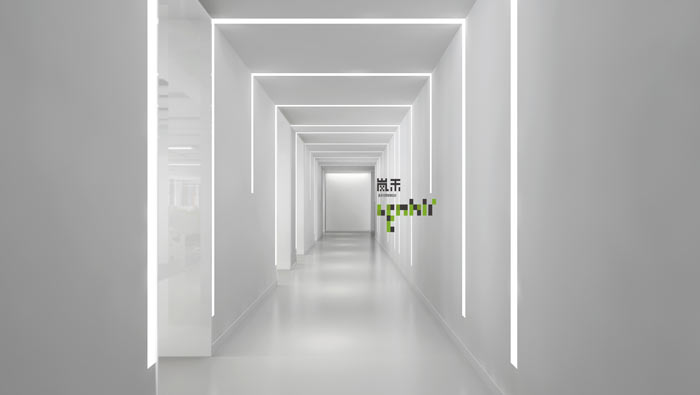 科技辦公室過道設(shè)計(jì):白色的墻體與燈光組成時(shí)空之門,讓人好似看到了一個(gè)又一個(gè)的世界,在震撼的同時(shí)也對(duì)科技產(chǎn)生期待,時(shí)空如夢(mèng)如幻的感覺,是對(duì)科技最好的詮釋。