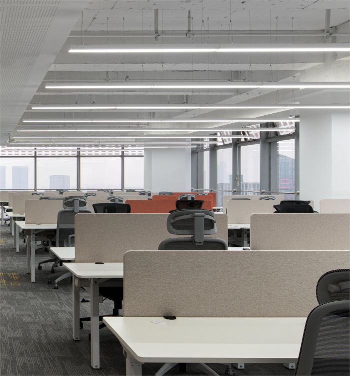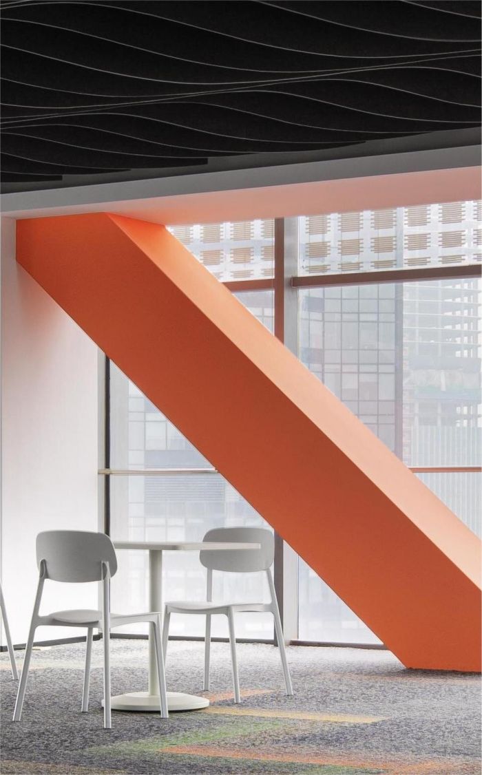 空間的一角設置有員工休息區,員工可以在這個空間里休息和討論,桌椅的不同組合讓這個空間也可以作為大型培訓的場所。空間內有一個橙色的V字,是對空間原有建筑的延續,使得整個空間靈動。