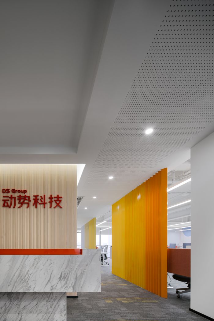 前臺空間使用了白色大理石材質,整體風格簡潔優雅??臻g右側使用企業的品牌色黃色和橙色設置了一個線條隔斷,用于分隔入口區域和辦公區,保護企業辦公空間的隱私??臻g讓來訪者感覺流暢現代,同時也充滿了企業的個性。