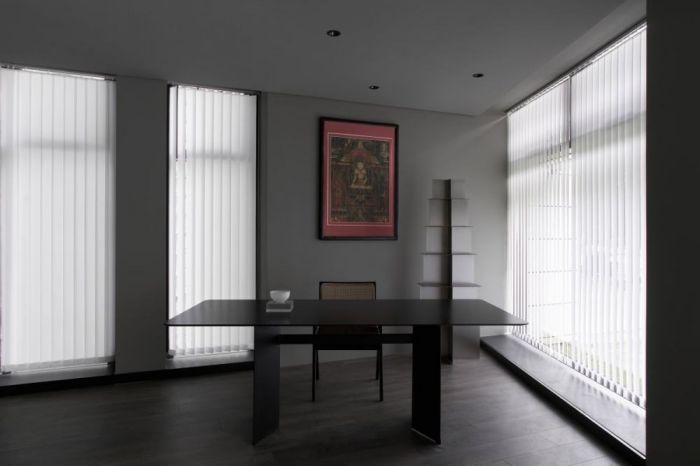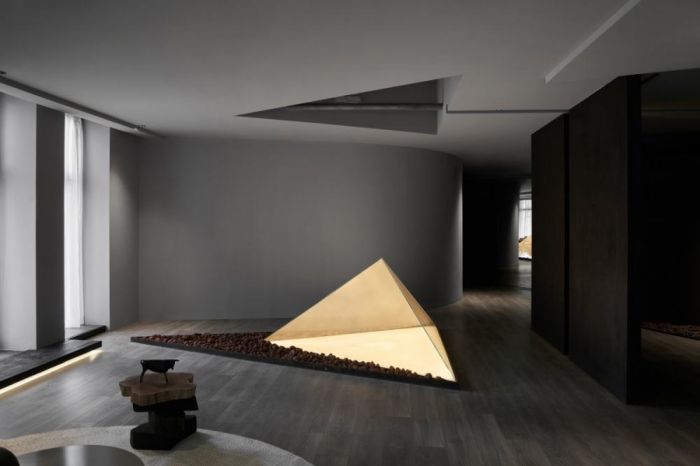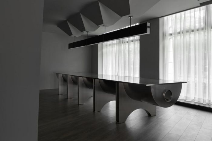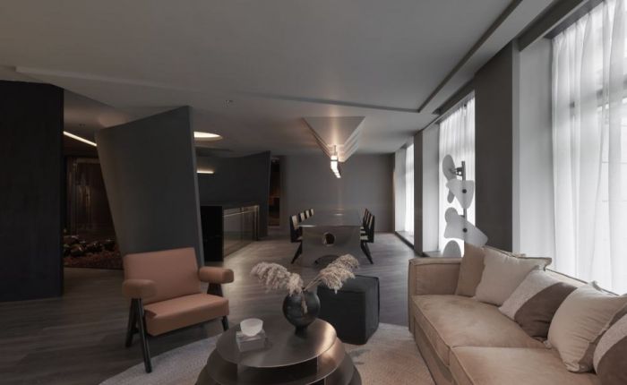 這是位于杭州公元大廈的國立酒業辦公會客廳的空間設計。空間結合了辦公和會客的功能需求,特別強調在白酒公司的工作環境中融入酒文化的精神需求。設計師從“酉”字的象形概念出發,通過空間布局和形態學的應用,創造了一種流動且富有層次的室內環境,有效區分并聯系了公共會客廳和私密辦公區域。