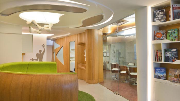 接待區域的設計:設計師在設計的時候,將其安置在前臺區域的后方,在形狀的選擇上,設計師選用了半圓形,在設計師看來這樣的設計有其天然的優越性,半圓形在此處瞬間感覺空間突然上升了一個層次,同時又不會對整體空間造成影響,做到實用與形象并存。