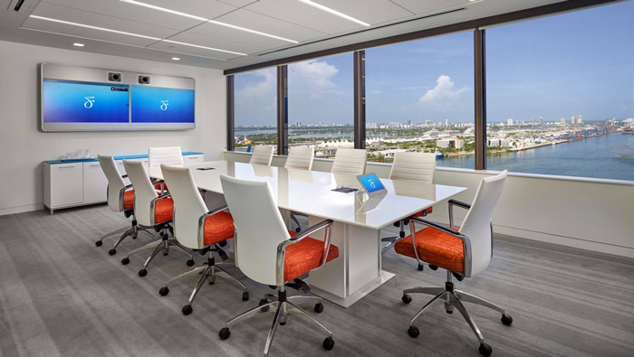 辦公室會議室設計:此處與前臺相鄰,設計師這樣設計的目的,是希望會議室可以額外承擔起接待、洽談、交流的作用,設計師的想法就是讓一個空間可以多樣化,讓空間利用達到最大化。