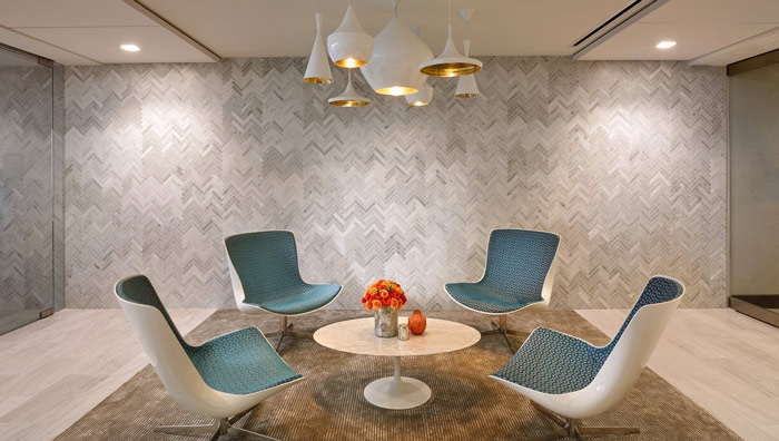 辦公室接待區域設計:此處與前臺空間在一個空間之中,因為地毯的原因讓其區別于整個空間,四個座椅的擺放剛好形成一個圓形,在使用上更有利于溝通,在寓意上有圓滿的意味在其中。