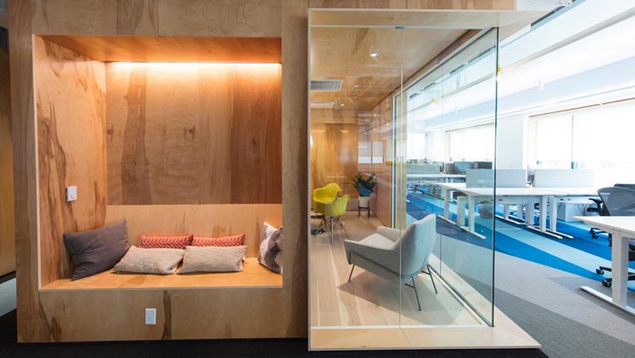 網絡公司辦公室動線設計:設計師在設計的時候,考慮到此處空間地處空間的內側,故此讓光源可以投入此處空間之中,動線的設計也采用不同的色彩進行表現,設計師希望通過這樣的設計增加空間的通暢與方便。