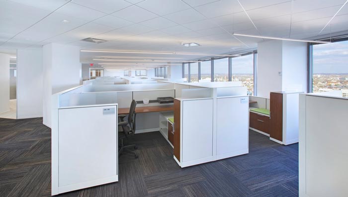 辦公區(qū)域的設(shè)計:此處也是開放、封閉的結(jié)合體,此處給人的第一感覺就是明亮、開放,每一個封閉的空間都是一個工位,但是此工位的設(shè)計也十分有講究,當(dāng)員工起身就可以看到整個空間,讓人在立與坐看到的風(fēng)景是不同的,立看到的是一個開放的空間,讓人的心瞬間變得開朗起來,坐下來看到的是工作,讓人能夠瞬間進(jìn)入工作的狀態(tài)。