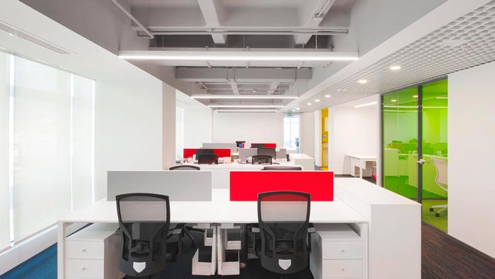 600平方辦公室辦公區設計:相信大家看到此處空間給人的第一感覺就是那一抹紅色,因為在一個以純白色為主題色的空間之內,它是那么的鮮艷、那么的惹眼,這也正是設計師希望給空間帶來的轉變,白色雖然可以在視覺上給人以向外散發的特效,但是長久下去會讓人感覺到茫然,那一抹紅色有畫龍點睛的效果。