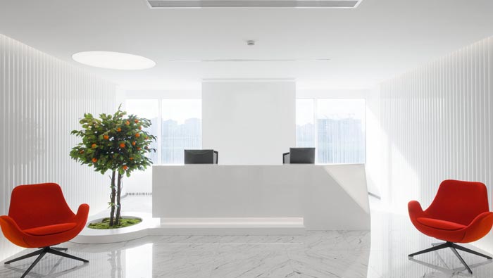 600平方辦公室前臺區設計:此處給人的第一感覺就是簡約、自然,眼光在設計師的設計手法之下,經過多次折射后的柔光進入室內,讓顧客進入空間之后會感覺到身心暖洋洋的,而且此處會根據每天陽光的高度、強度進行隨機變化,讓客戶每次到來都感受到不同的空間氛圍。
