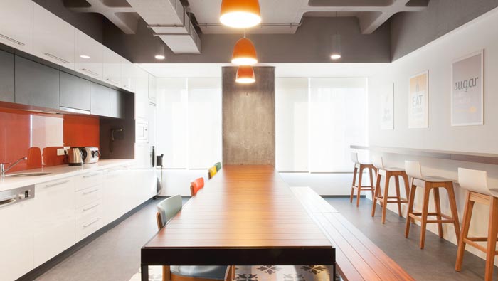 600平方辦公室茶水間設計:相信對于辦公室了解的人一定能夠知道,茶水間的設計大部分都是與休息區域融合在一起,這樣做的目的就是希望將空間的作用發揮到極致,設計師在此基礎上對空間進行了升級,色彩的加入為空間增添了一種全新的魅力。