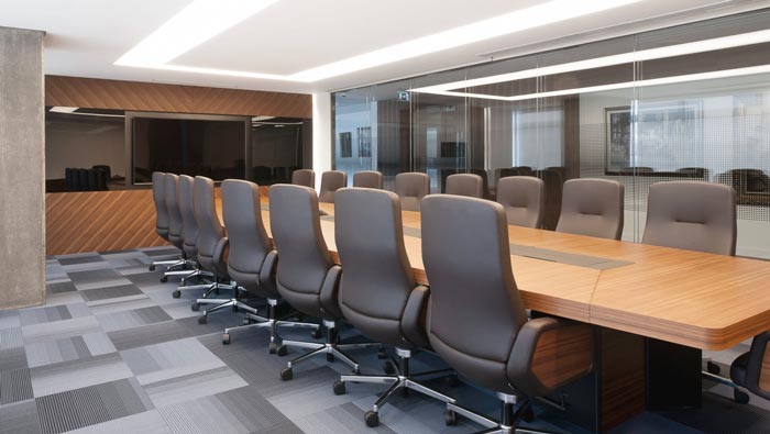 600平方辦公室會議室設計:此處的亮點就是在會議桌的選擇上面,會議桌給人的第一感覺就是厚重,這也正是設計師希望給大家帶來的場景,設計師希望通過這一抹厚重,讓人從煩躁中脫離,因為在設計師看來,事情的解決不是靠一時興起,而是需要一步一個腳印的走下去。