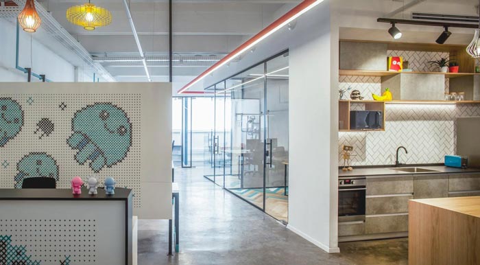 260平方辦公室接待區設計:此處給人的第一感覺就是活潑、可愛,游戲人物的出現讓我們仿佛回到了童年一般,讓往事在我們的腦海中重現,目的就是希望員工可以時刻保持一顆童心,孩子的創造力是無以倫比的。