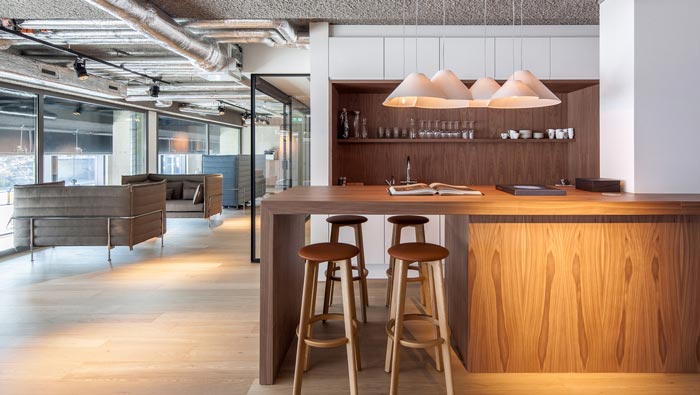 吧臺的設計:設計師將吧臺與茶水間進行了有機的結合,其目的就是希望給空間更多的屬性,設計師要做的就是將每一個區域進行融合,在設計師看來由于空間的面積有限,故此在設計中一定要考慮到各個方面的融合,也只有如此才能將空間利用到最大化。