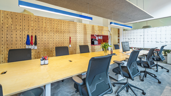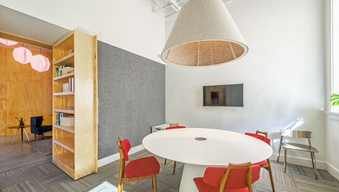 小型會議室的設(shè)計(jì):我們首先看到的就是一個(gè)機(jī)關(guān)門,在外看是一個(gè)書架,往內(nèi)推開卻是另有一番天地,這也是設(shè)計(jì)師設(shè)計(jì)中的一點(diǎn)點(diǎn)小趣味,在設(shè)計(jì)師看來趣味是辦公中的調(diào)劑,設(shè)計(jì)師希望員工在辦公中不是一成不變的,而是幽默、活躍、有趣。