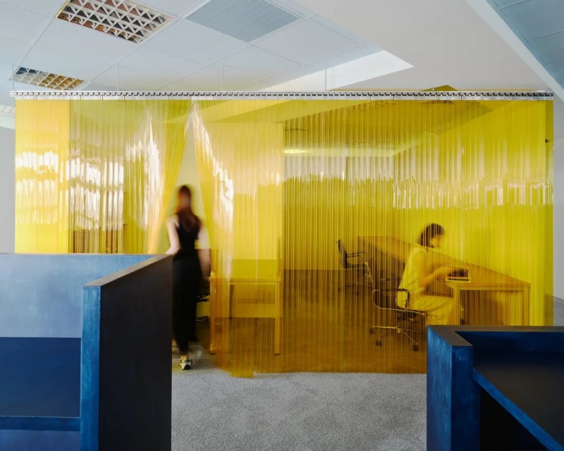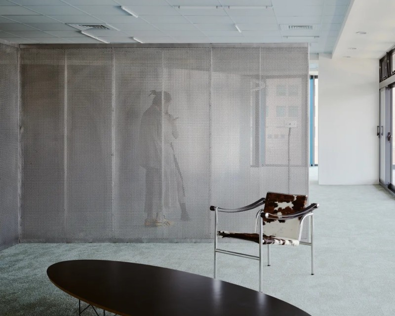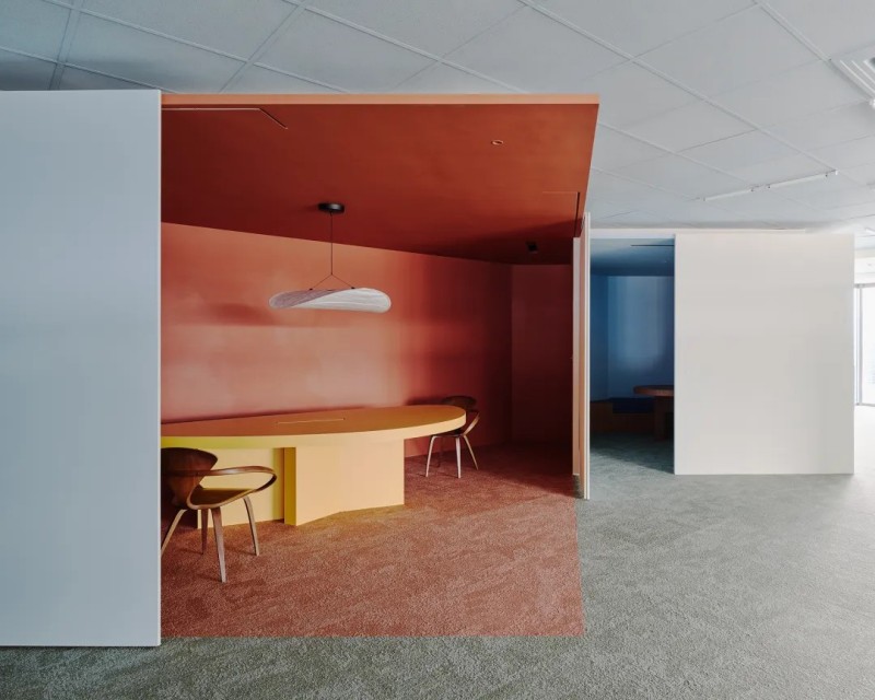 為此,設計師將入口臨窗西曬側設定為短暫停留的動線區,讓工作位置脫開日曬范圍,別于傳統接待柜臺及等候區模組,我們設計幾座高背座椅建構這段過度空間,這些看似隨機的塊面如雕塑錯落于窗邊,比固定隔間更具靈活性,其造型易于控制屏蔽比重又能遮陽,訪客候位可于椅陰影乘涼,業主也能利用如墻形式配置品牌訊息。