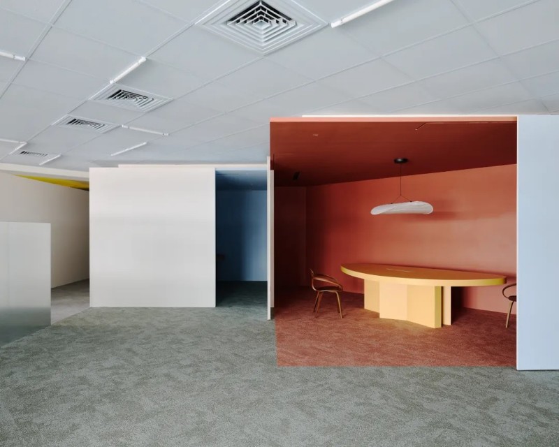 在假期國際的辦公空間設計邏輯中,設計師拋開辦公室點到點、格狀切割空間的形式,改以回繞、非定向的空間路線制造蜿蜒,讓使用者行走間對環境產生「探索」之感,而非傳統僅求效率、壓縮個體感受的工作環境。設計師希望透過回繞行走,即使座位至茶水間的片刻都能讓緊湊生活得到喘息節奏,如同自我療愈的儀式。