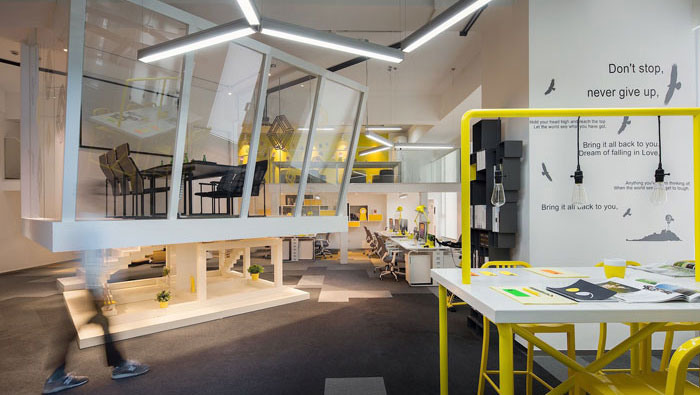 會議室的設計,設計師將其安置在空間的中心,一則做為企業的亮點存在,二則懸空的空間給人以俯視的感覺,本空間不論是內部還是外部都攜帶創意的屬性,這樣的空間使人靈感無限。