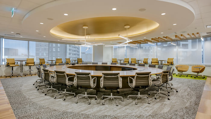 會議室效果圖:圓形的會議桌椅占據了空間的中心區域,將空間的中心完美的使用起來,外環設計師利用吧臺桌椅搭建一個環形的座椅,以此加大會議室的實用率。