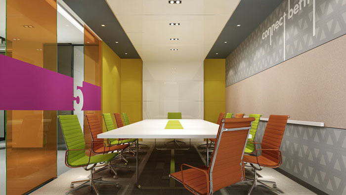 會議室效果圖:空間的一邊為落地窗,這也是設計師選擇此處為會議室的重要原因,設計師希望可以借助外界的景色,沖淡會議中的乏味,讓大家可以群力群策。